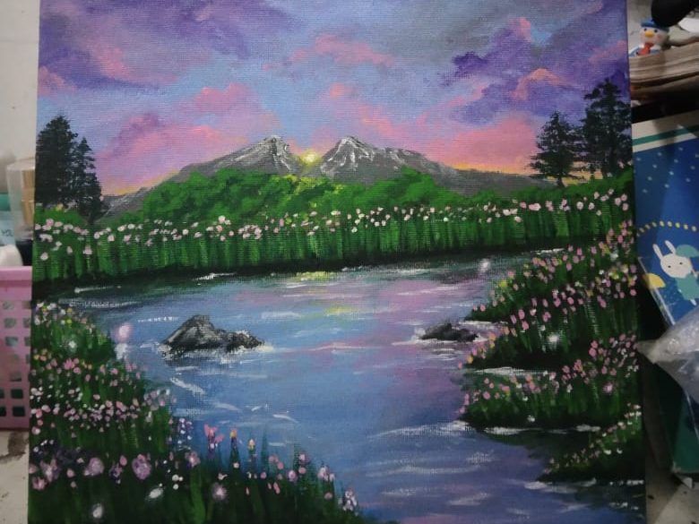 “Aliran Sunyi di Bawah Langit Ungu” Langit ungu yang lembut mencerminkan ketenangan dan keharmonisan alam.